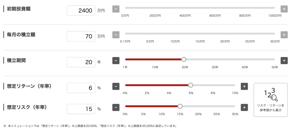 例えば私は今2400万円の運用資産を持っています。それを初期投資額として、そこに毎月70万円を20年間、積立続けたとします。年利を5%で計算してみましょう。MUFG つみたて(積立)投資シミュレーションを利用してみます。